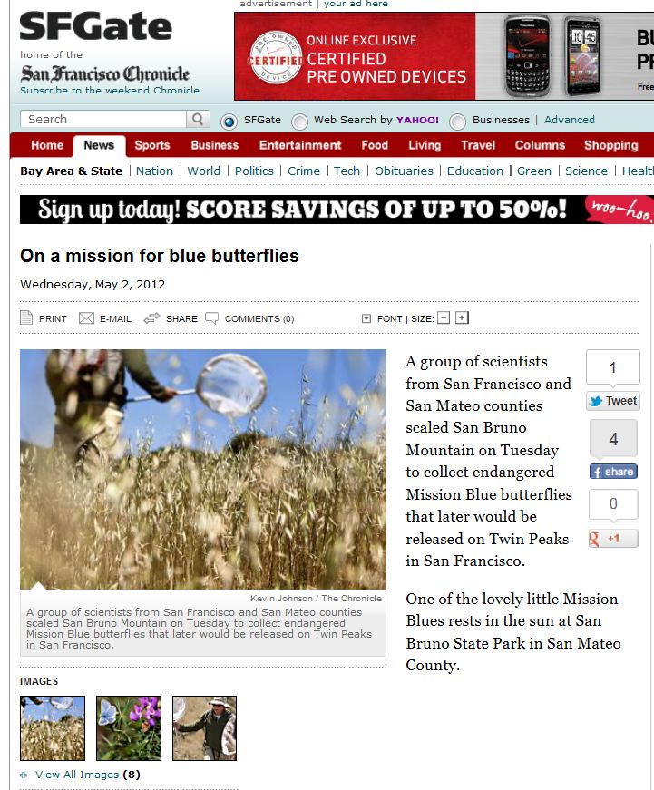 Creekside Science has been coordinating with the San Francisco Parks Department, Liam O’Brien, and US Fish and Wildlife Service on an important reintroduction project that moves Mission blue butterflies from San Bruno Mountain to Twin Peaks. The goal of this project is to bolster the existing population at Twin Peaks by adding adult females and males in hopes that they will lay eggs locally. Here’s some news coverage from Channel 5 and the SF Chronicle regarding this project.