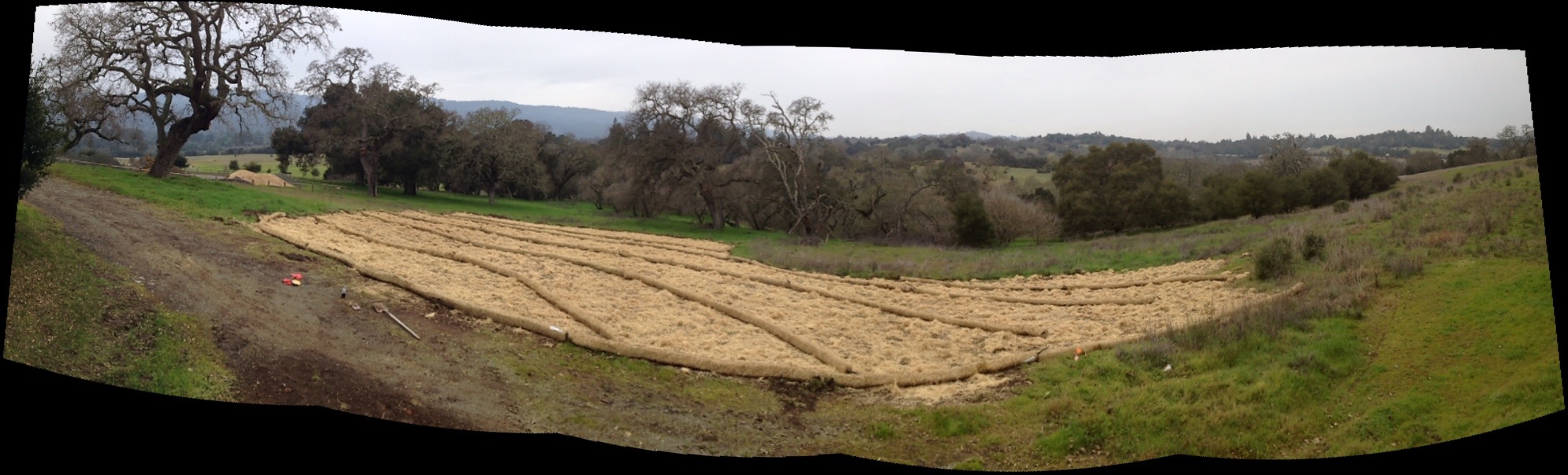We do use heavy equipment and scrape the ground at a depth of 3-6″. The bare soil is the scarified and sown with a native seed mix which includes material collected onsite. Finally the site is mulched lightly with a thin coat of weed-free rice straw and an assortment of straw wattles that will help reduce any potential erosion in the wet season before vegetation gets established.