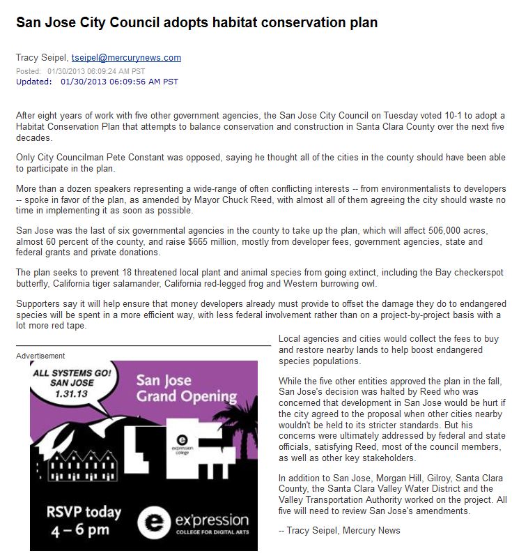 The staff of Creekside is very happy to report that the Santa Clara Valley HCP has been passed by the City of San Jose, the final signatory needed to enact this auspicious plan to help protect and restore habitat for 18 rare plants and animals including the Bay Checkerspot butterfly, Santa Clara Valley Dudleya and a few other species that Creekside currently works on conserving. We firmly believe that preserving and properly managing serpentine environments is critical for biodiversity in the Bay Area. Please contact us with any biological questions about the plan and/or species.