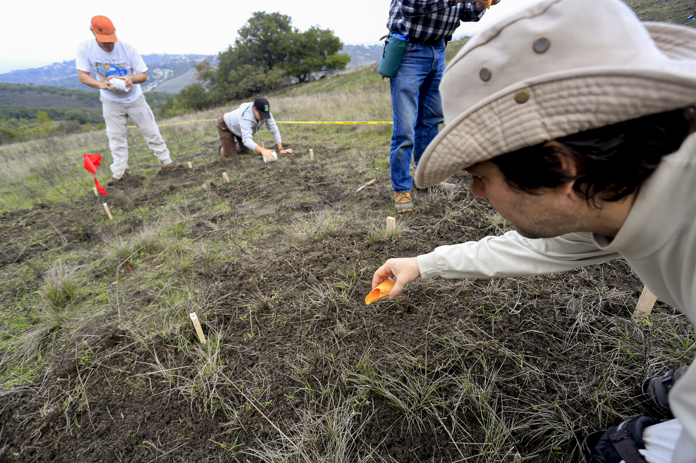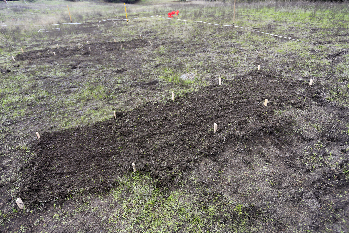 Packets of 250 seeds (prepared by the U.C. Berkeley Botanical Garden) were spread as evenly as possible into 30 square-meter plots, then tamped gently into the soil to enhance soil to seed contact.